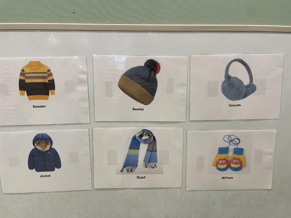 Since it is cold and frosty outside, it is a perfect time to introduce winter clothes to our little learners. We prepared some vocabulary words and some of it are already using it whenever we go outside. This words includes, Jacket, Socks, Shoes, Beanies, Scarf, Mittens, Earmuffs and Sweater.