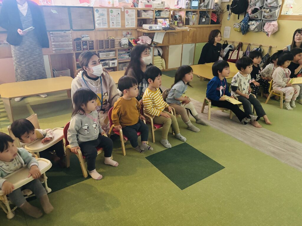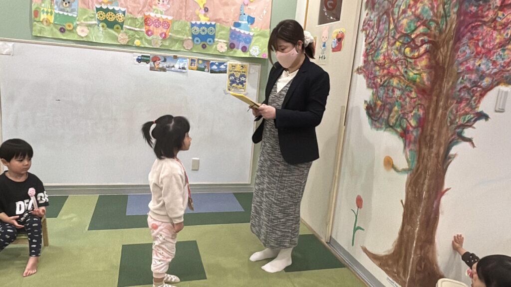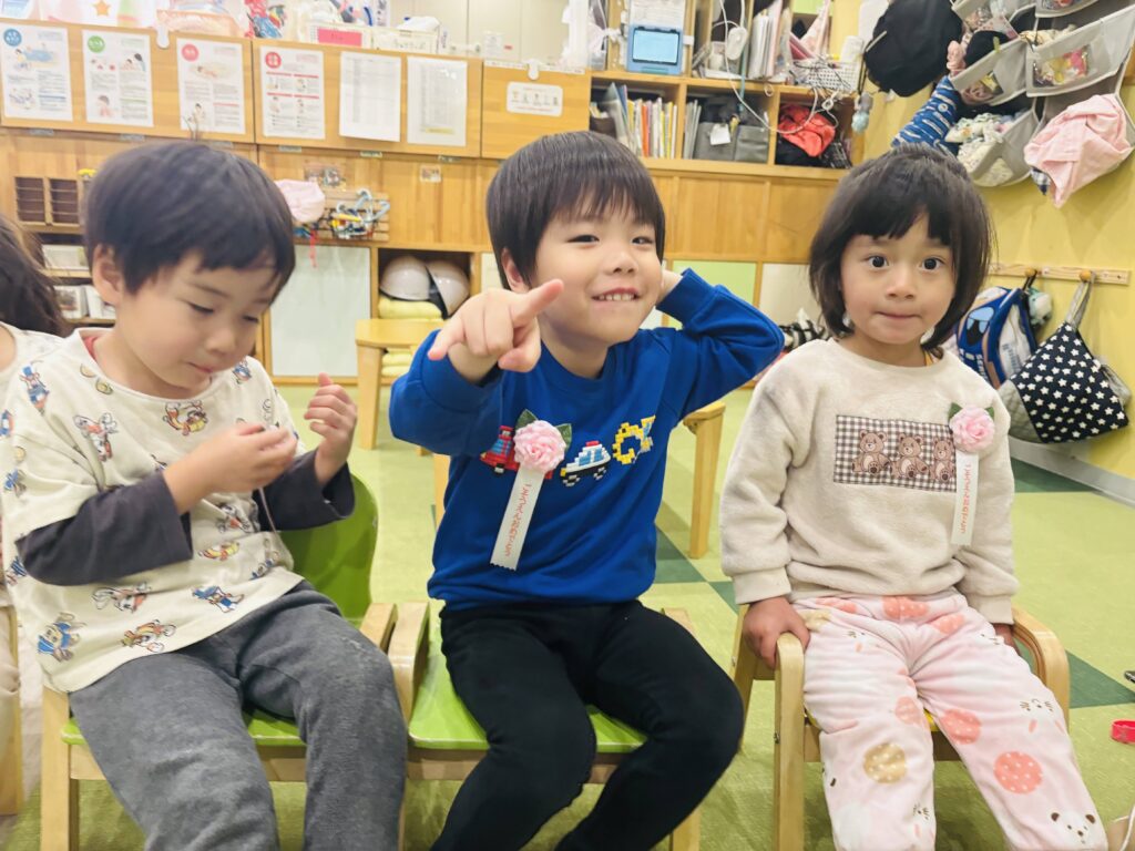 はじまりのことばから始まり、園児紹介では、卒園生の私物を元に「誰だろクイズ」をして、おともだちの皆に参加してもらいました☆