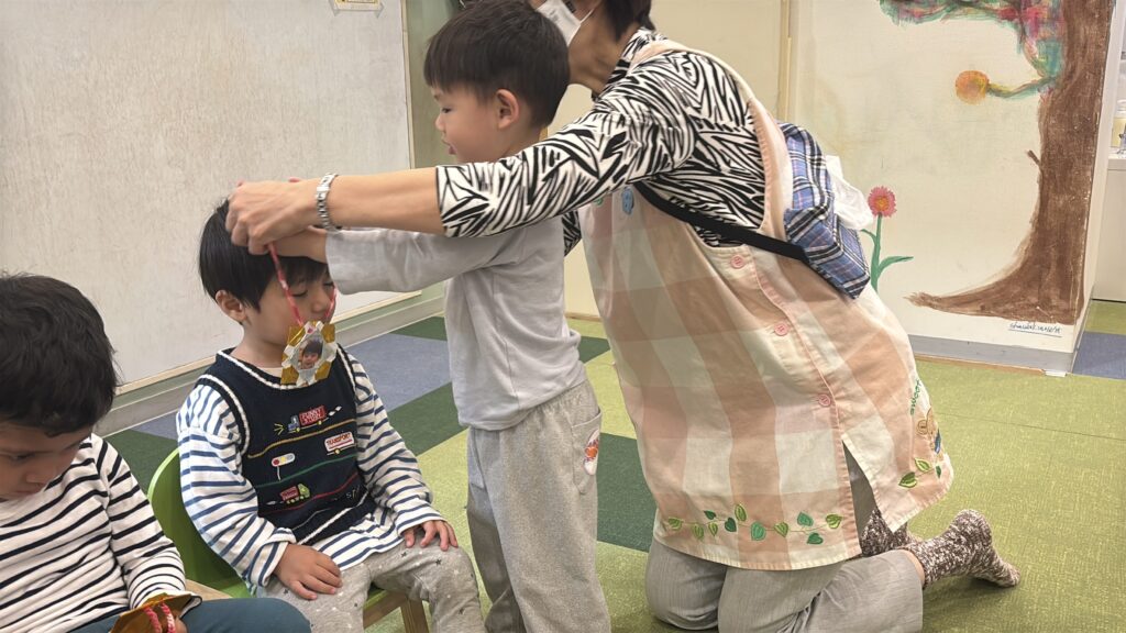 手作りペンダントをすみれ組のお友だちから首に掛けてもらいました♫