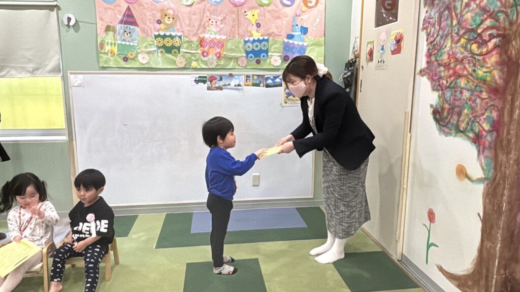 園長先生に名前を呼ばれたら前に出て卒園証書をもらいました!