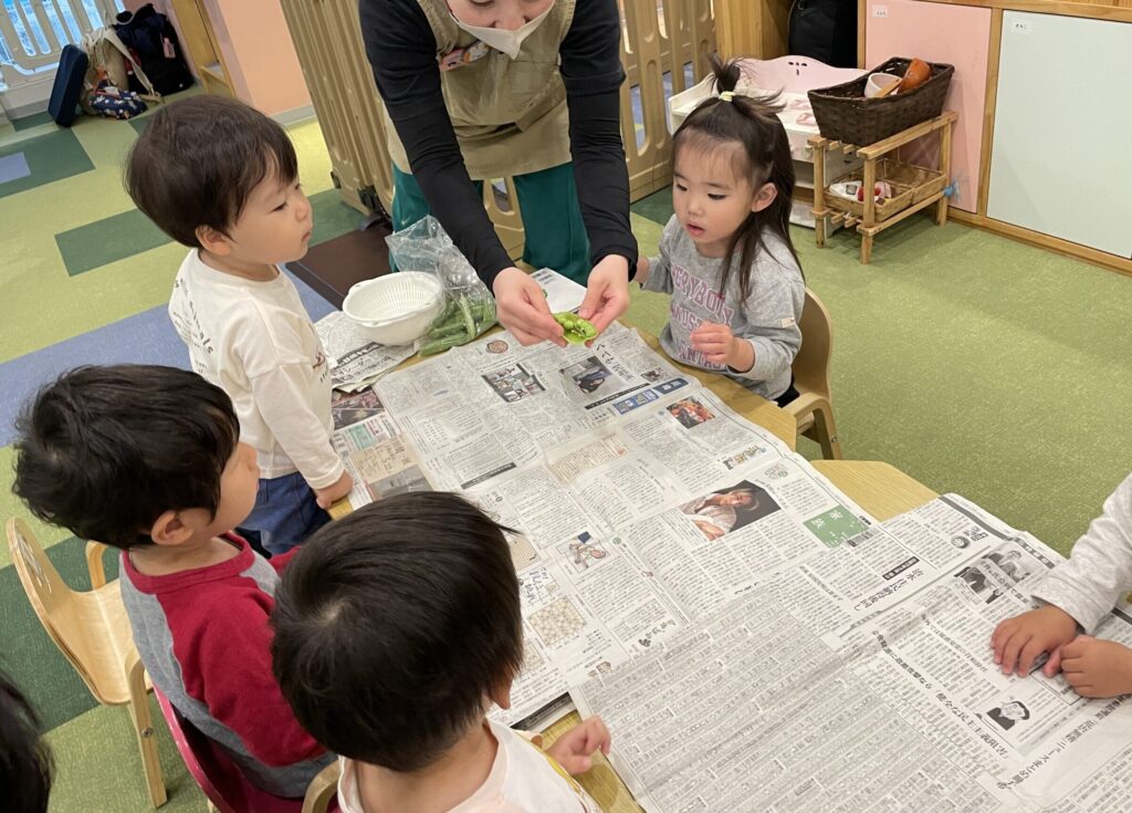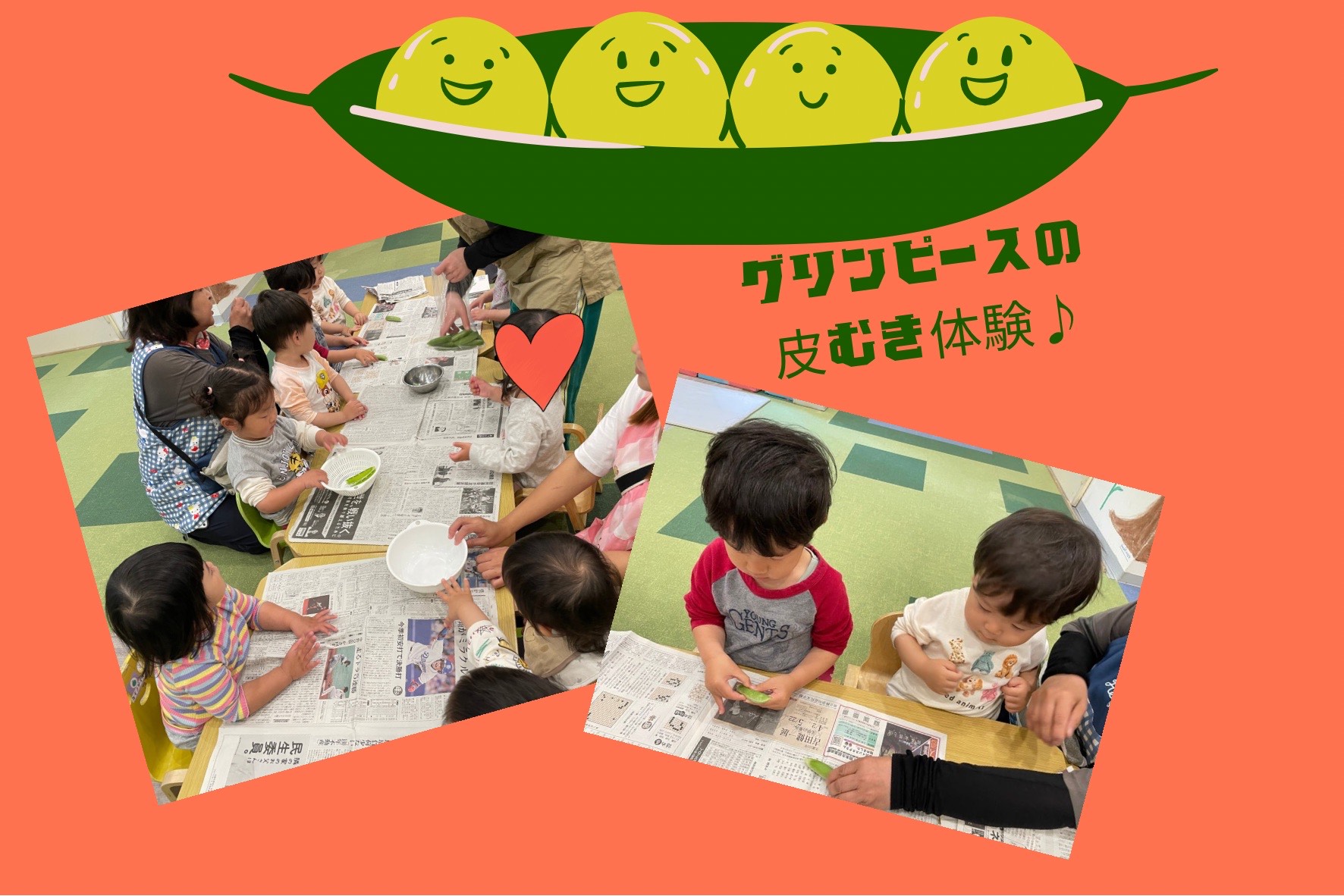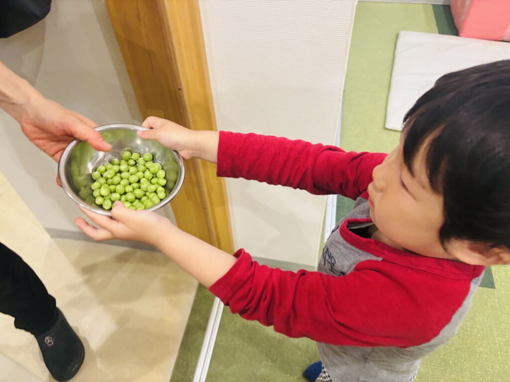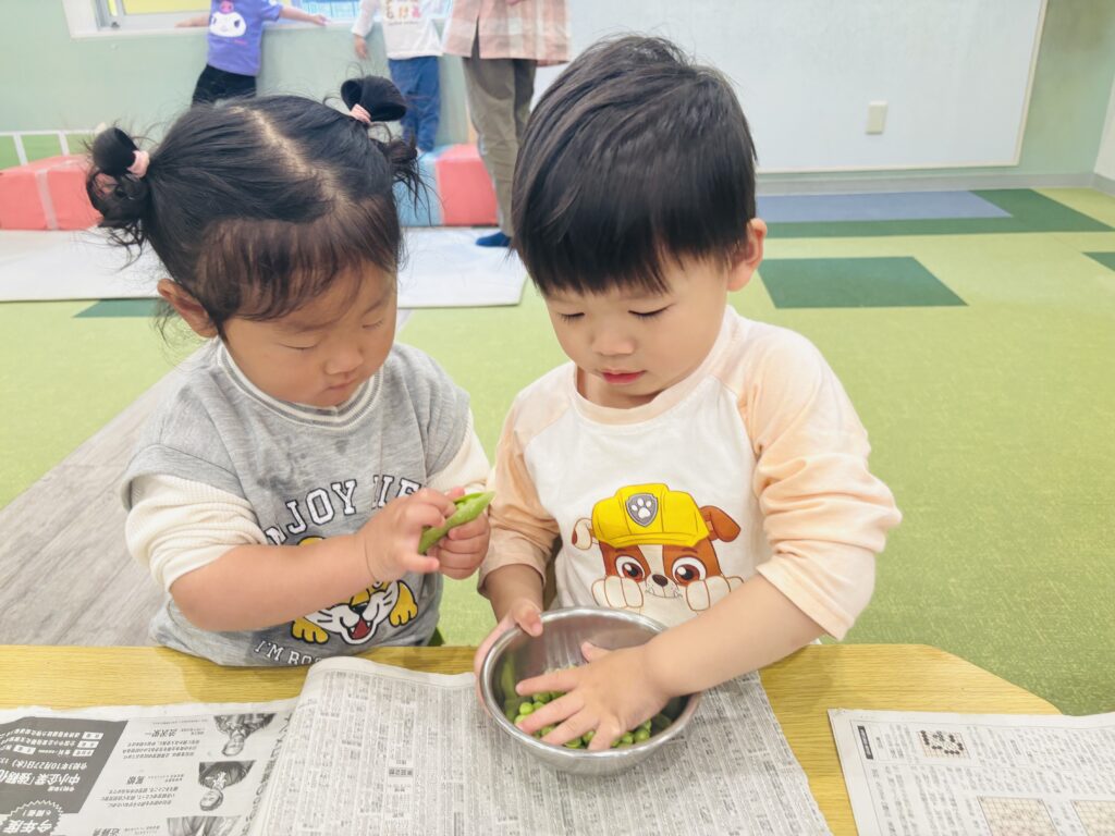 さくら組さん、すみれ組さんにグリンピースの皮むきをしてもらいました🎵
