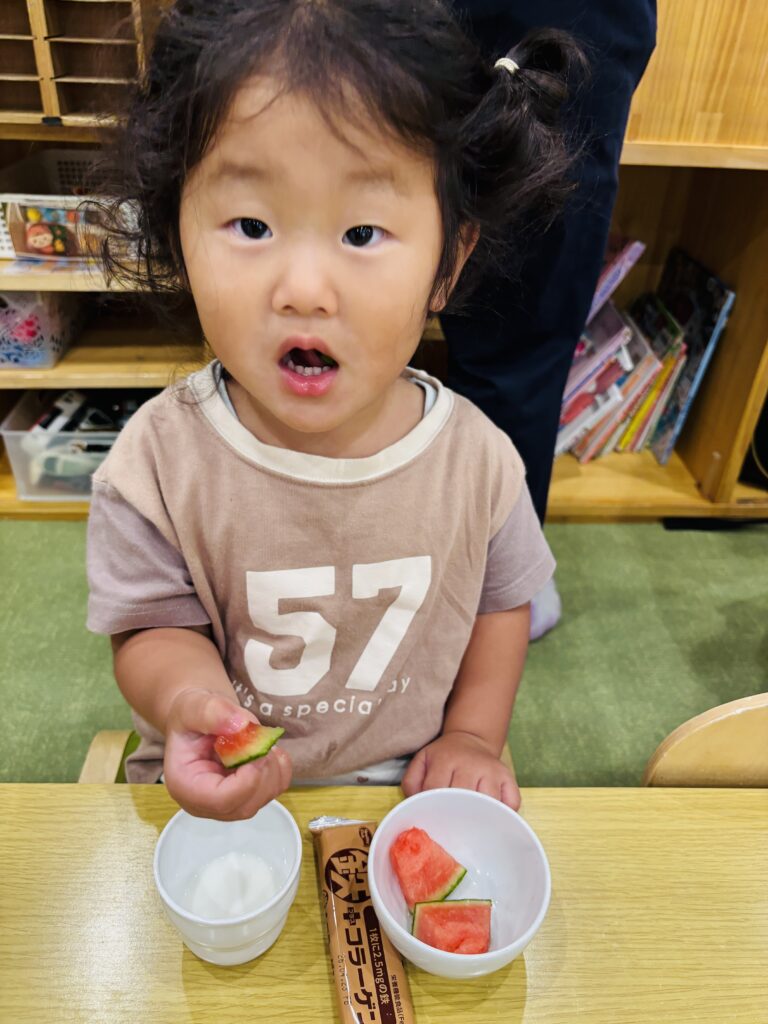 子どもたちは、おやつに新しいスイカを給食室で食べやすく切り、種を取って提供💚
