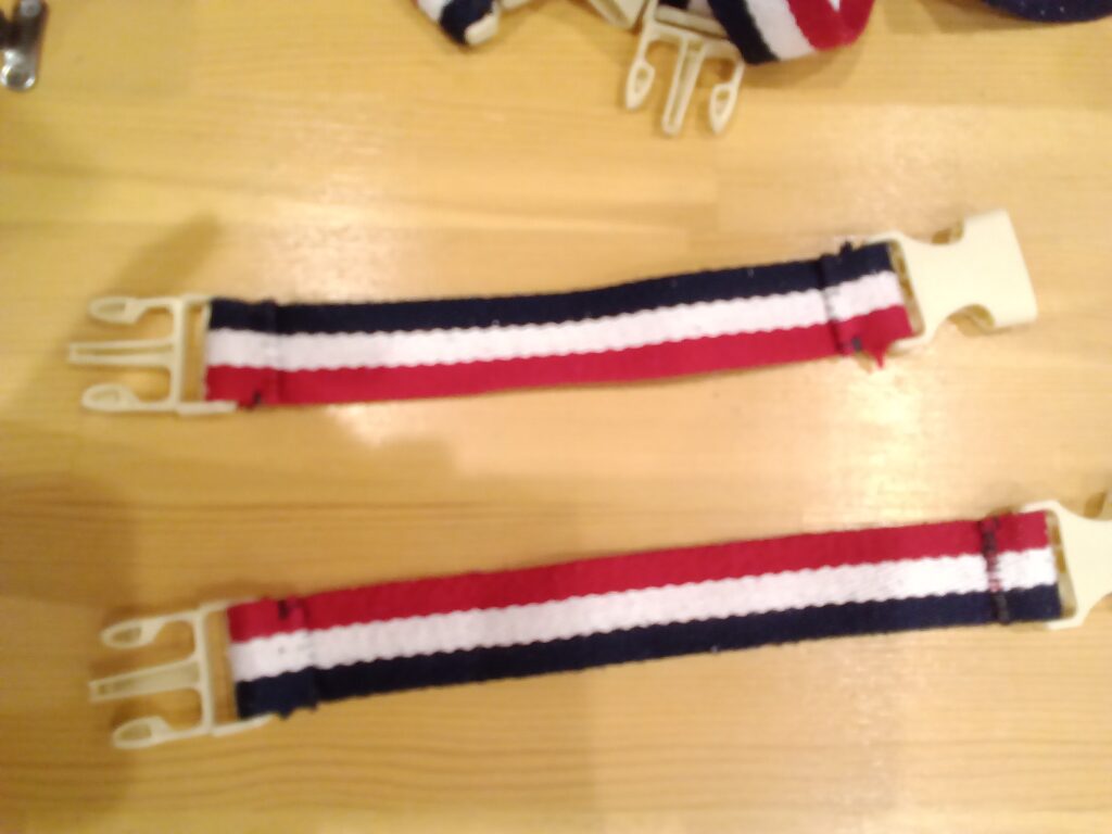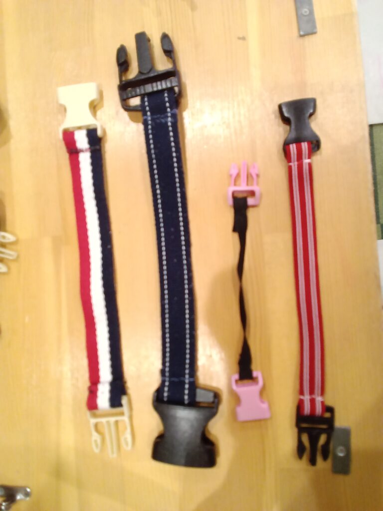 色々なサイズのバックルに、幅広の紐を、チクチク縫い付けただけの物です。