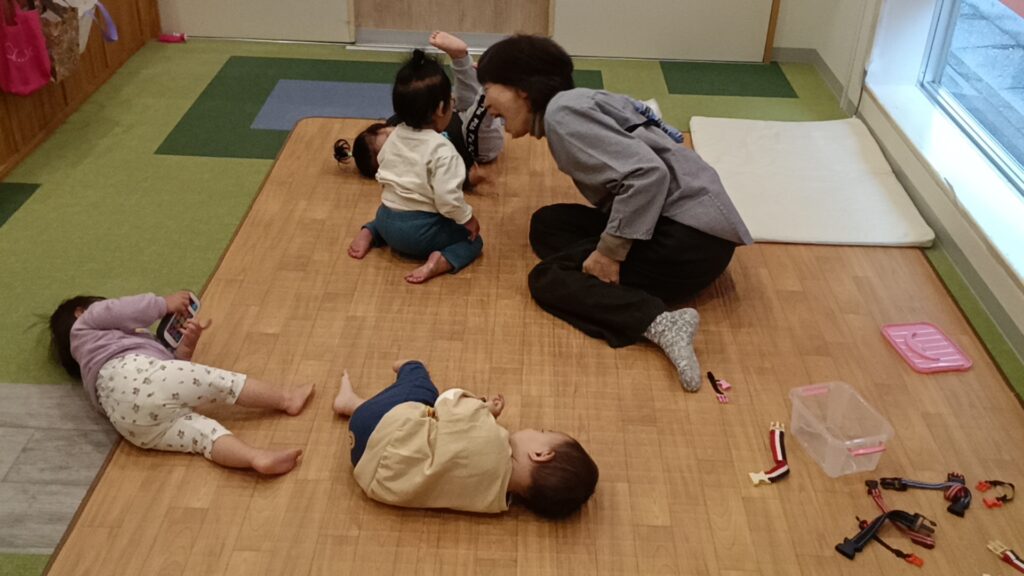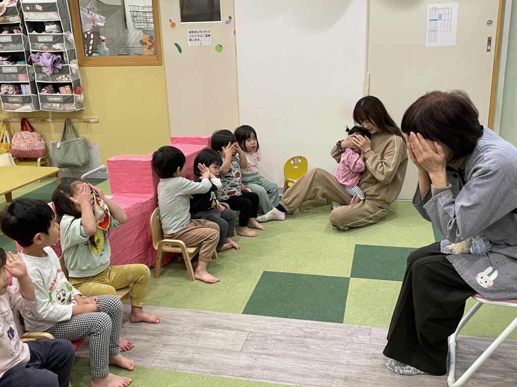 わらべうたには、いないいないばぁ遊びが出てくるものが、沢山あります。一緒に、顔を隠したり、バァで、目が合うと、大笑いしたり、にっこり笑顔を見せてくれる、子どもたちです。