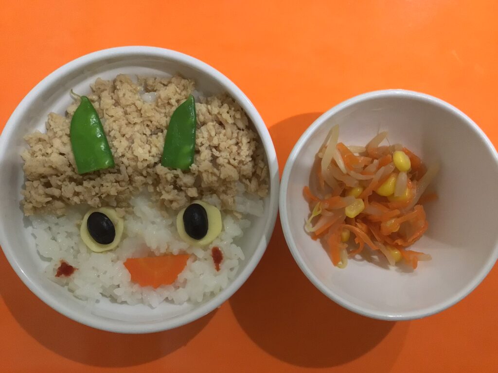 節分の日の給食メニューは、鬼のそぼろ丼とにんじんサラダ♫