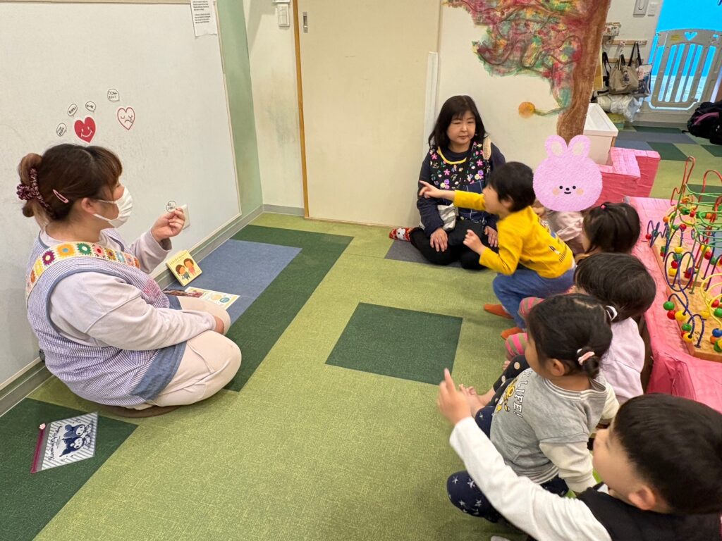 みんな興味津々…!「おともだちのおもちゃを壊しちゃった場合はなんていうかな?」「ドーナツが1個しかなくて、二人で食べる時はどうするかな?」などの問いかけに、「ごめんなさい」「はんぶんこ!」などと答えてくれるお友だちもいました🍩